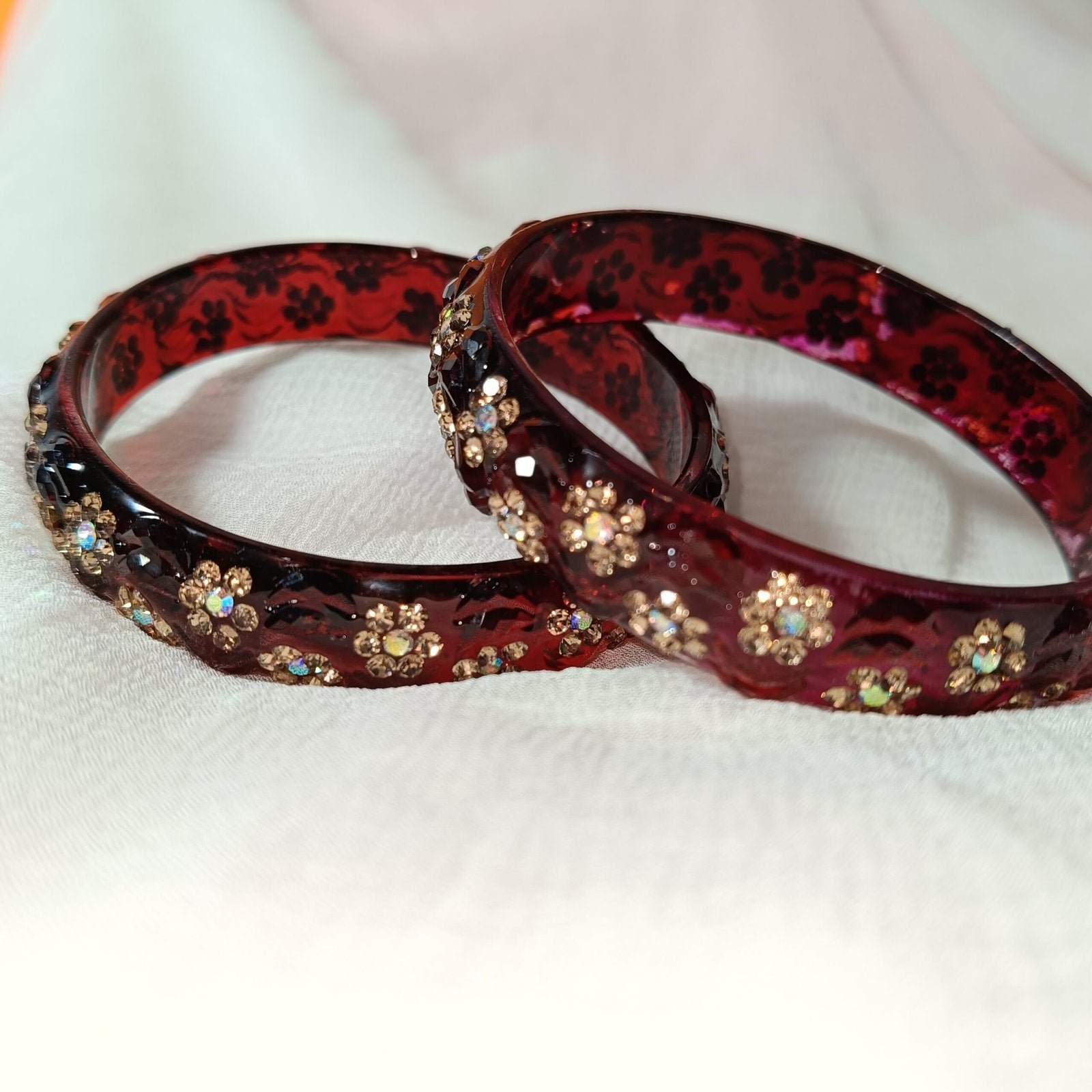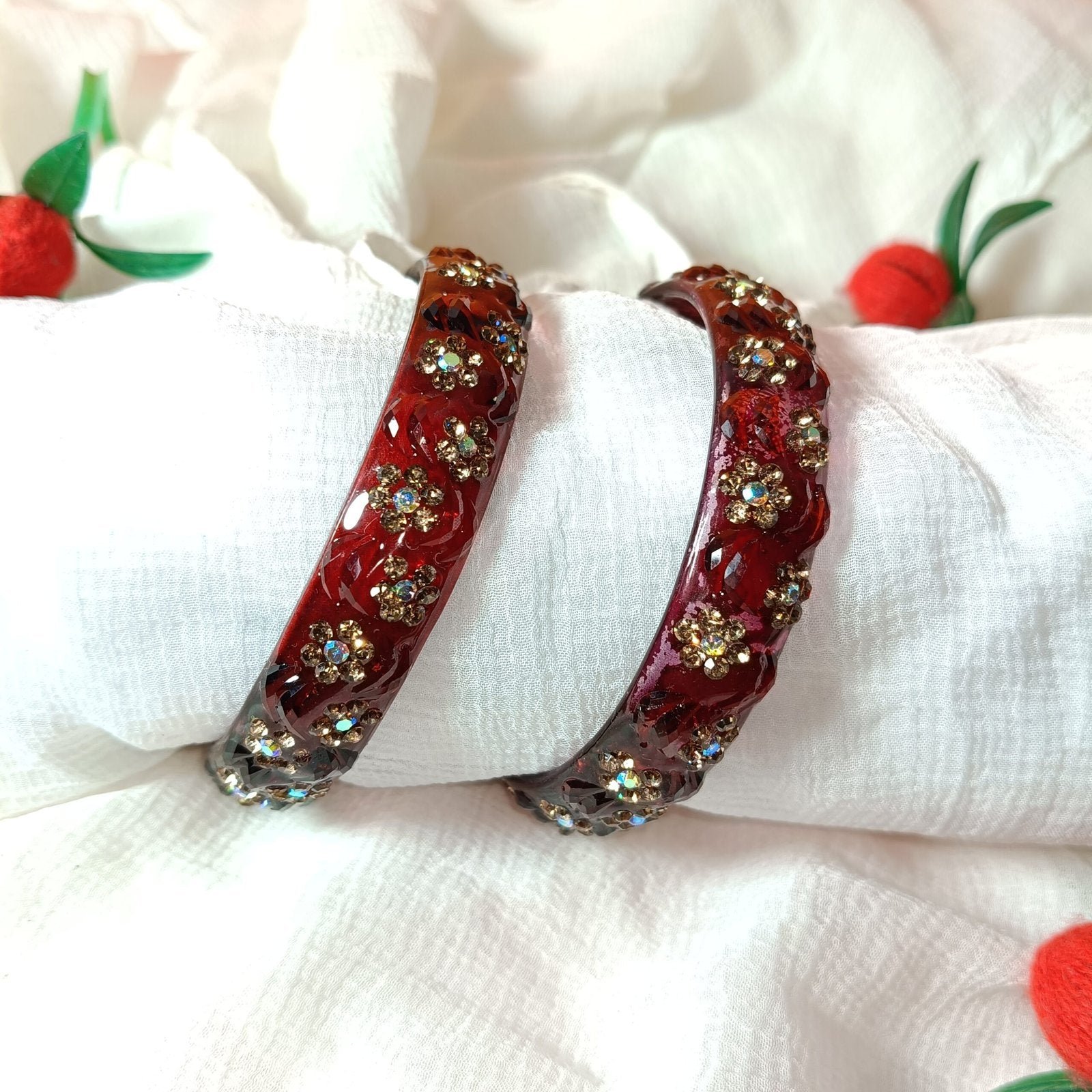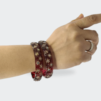 Elegant Ruby Red Glass Bangle Set of 2+4 – Floral Stone Embellishments ❤️