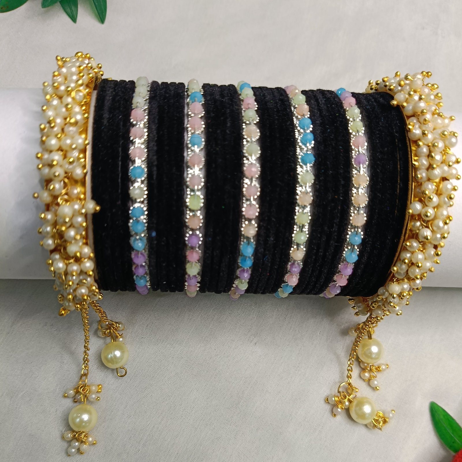 π€ Noir Luxe Velvet Bangles with Pearl Kada Bangle Set π€